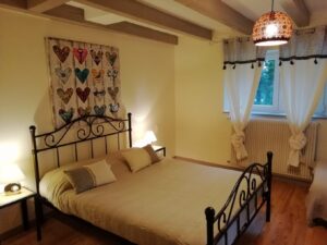 Le Domaine de Solène a eu l’occasion de travailler avec ROMANBRANCE dans le cadre de la rénovation de la chambre dite « bleue ». Ne me demandez pas pourquoi elle est appelée ainsi, elle n’a jamais été bleue. C’est là l’un des nombreux secrets de Solène… Quoiqu’il en soit, une étagère dessinée par votre hôte ainsi que deux tables de chevet ornent cette chambre afin d’y donner un décor plus douillet et cocooning.